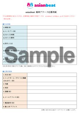 ・ニックネーム・コメントは、アジアンビートサイト内および、「福岡モーターショー2014」での展示、最優秀作品発表時に使用致します。事前にご了承下さい。