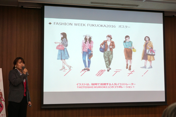 さらに運営事務局のスタッフ 柴田恵さんから、「F.W.F2016」のコンセプトやデザイン、企画内容が発表され、「F.W.F2016では、福岡県内だけでなく、アジアも視野に入れた取り組みを展開していきます。福岡の学生やクリエーターとの多彩なコラボレーション企画を通じて、これまで以上に多くの方々を巻き込んだ“ファッションの街・福岡”を、国内外に広く発信していきたい」との意気込みも。